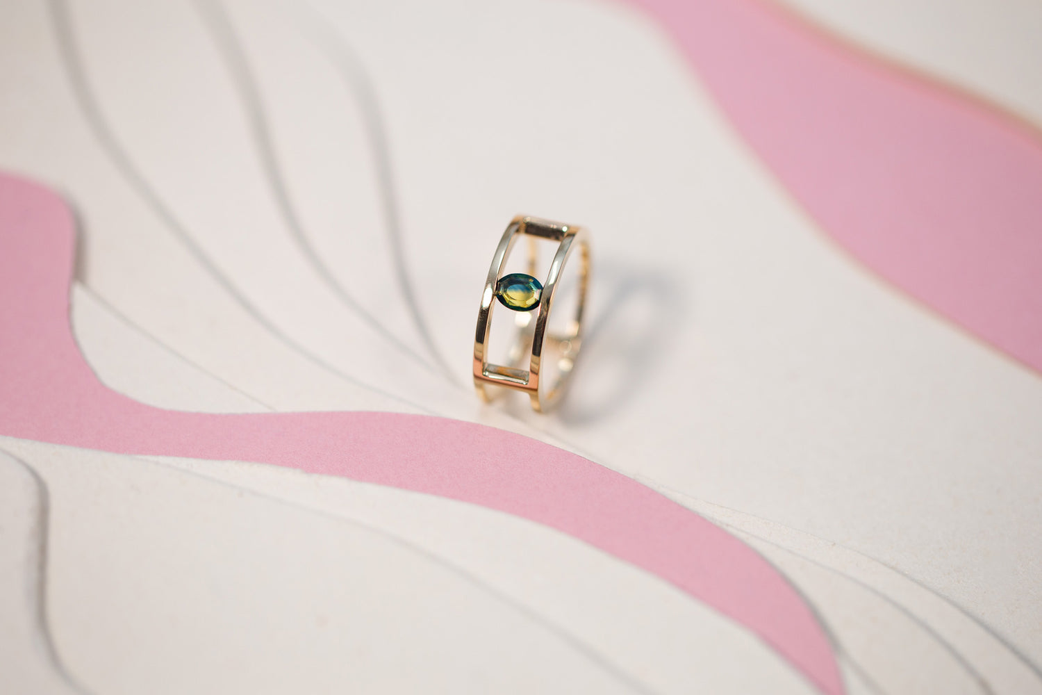 "Une gemme aux reflets changeants, posée entre deux lignes d’or. Le saphir bicolore dévoile une teinte double, rose et dorée, dans une mise en scène épurée. Un bijou aérien, aux lignes franches, où la pierre semble flotter dans l’espace."