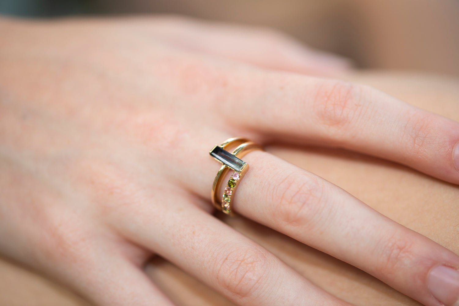 "Un sommet minéral où les contrastes prennent vie. La tourmaline noire s’élève, puissante, au cœur d’un envol de couleurs. Rose, vert, nuit : chaque pierre compose une altitude chromatique, dans une spirale audacieuse et maîtrisée."