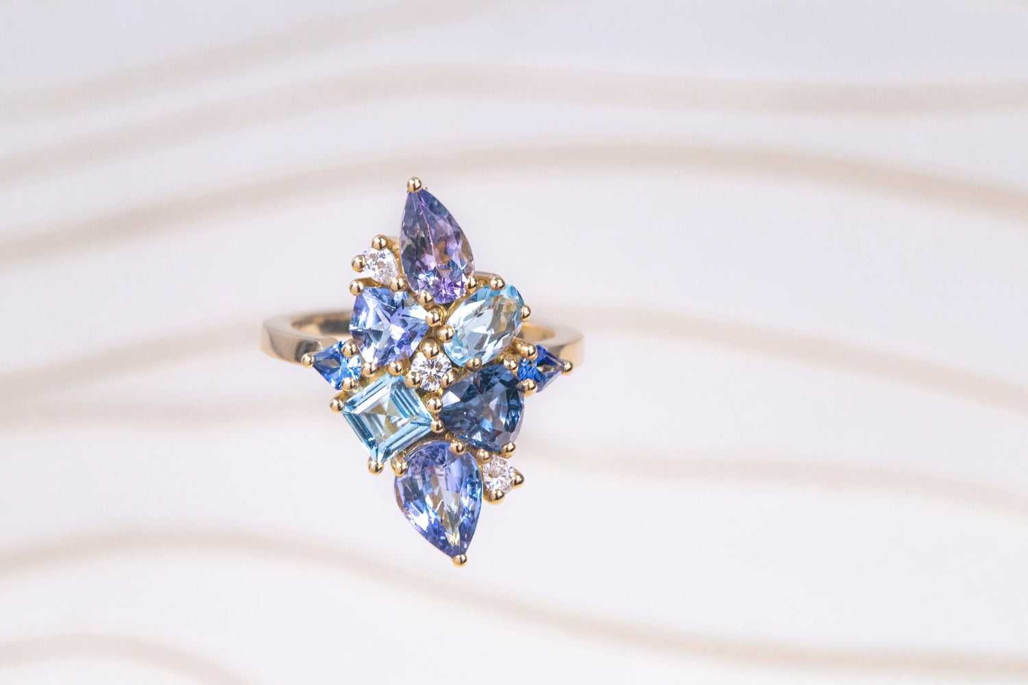 Bague en or 750°° recyclé, tanzanite, spinelle, aigues-marines, saphirs et diamants.