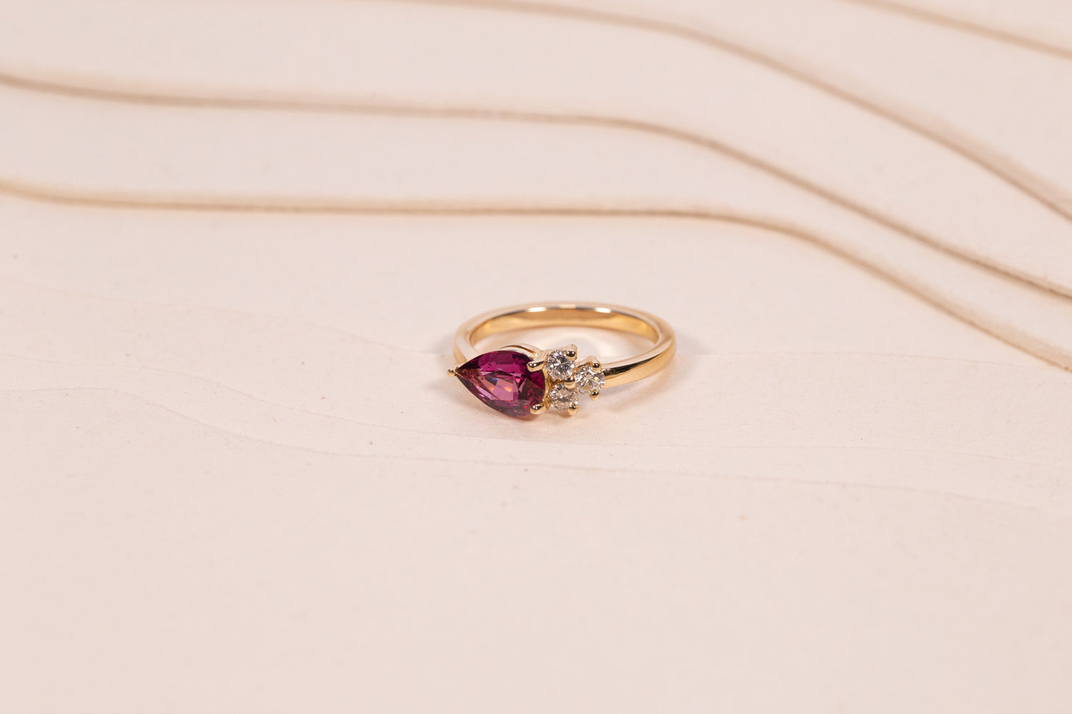 "Une constellation de pierres autour d’un grenat ardent. Les diamants dessinent un halo lumineux qui révèle la profondeur de la gemme centrale. Une bague solaire et raffinée, comme une promesse silencieuse."