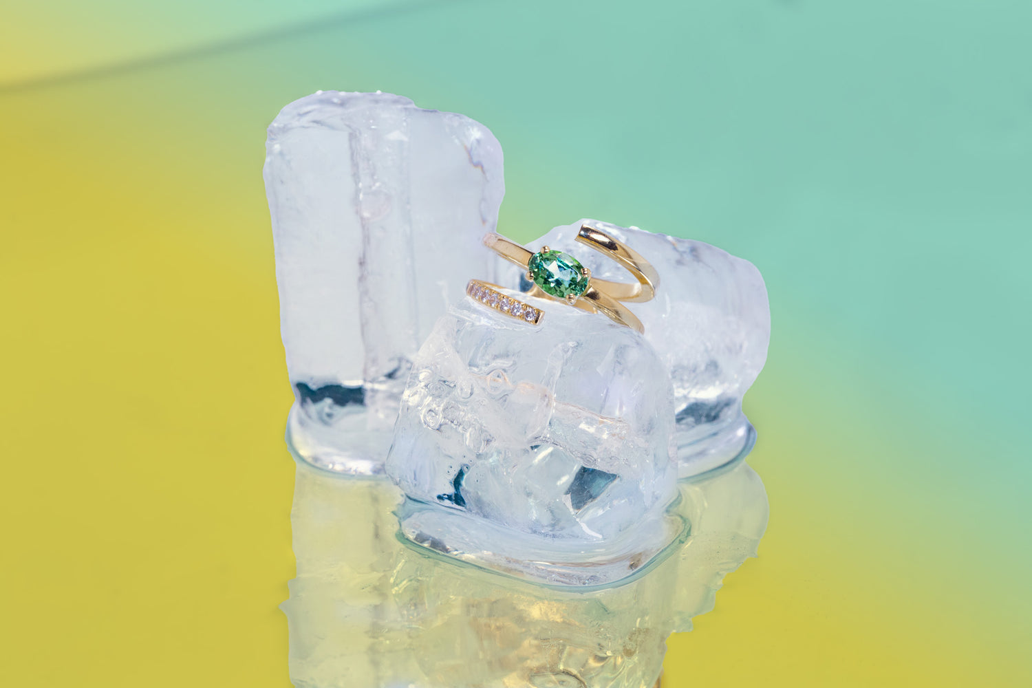 "Une spirale vivante portée par un vert profond. La tourmaline, vibrante et intense, dialogue avec la lumière des diamants comme un feuillage traversé par le soleil. La composition, aérienne et asymétrique, trace un paysage minéral aux contours organiques et précieux."
