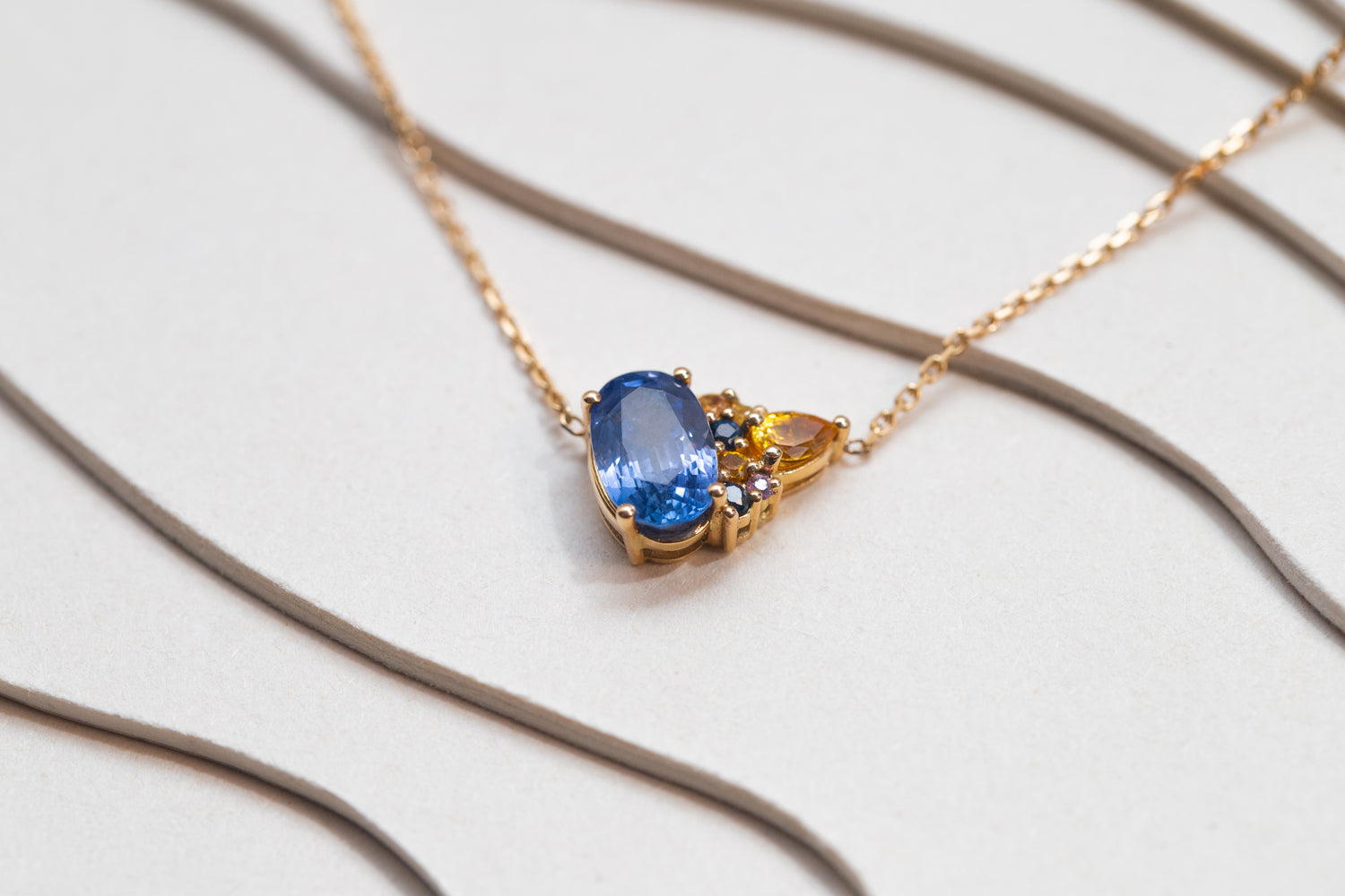 "Un saphir ancien, intense et chargé d’histoire, dialogue ici avec une constellation de saphirs multicolores. Cette pièce imaginée comme un hommage lumineux à la mémoire des pierres et à leur pouvoir de transmission."