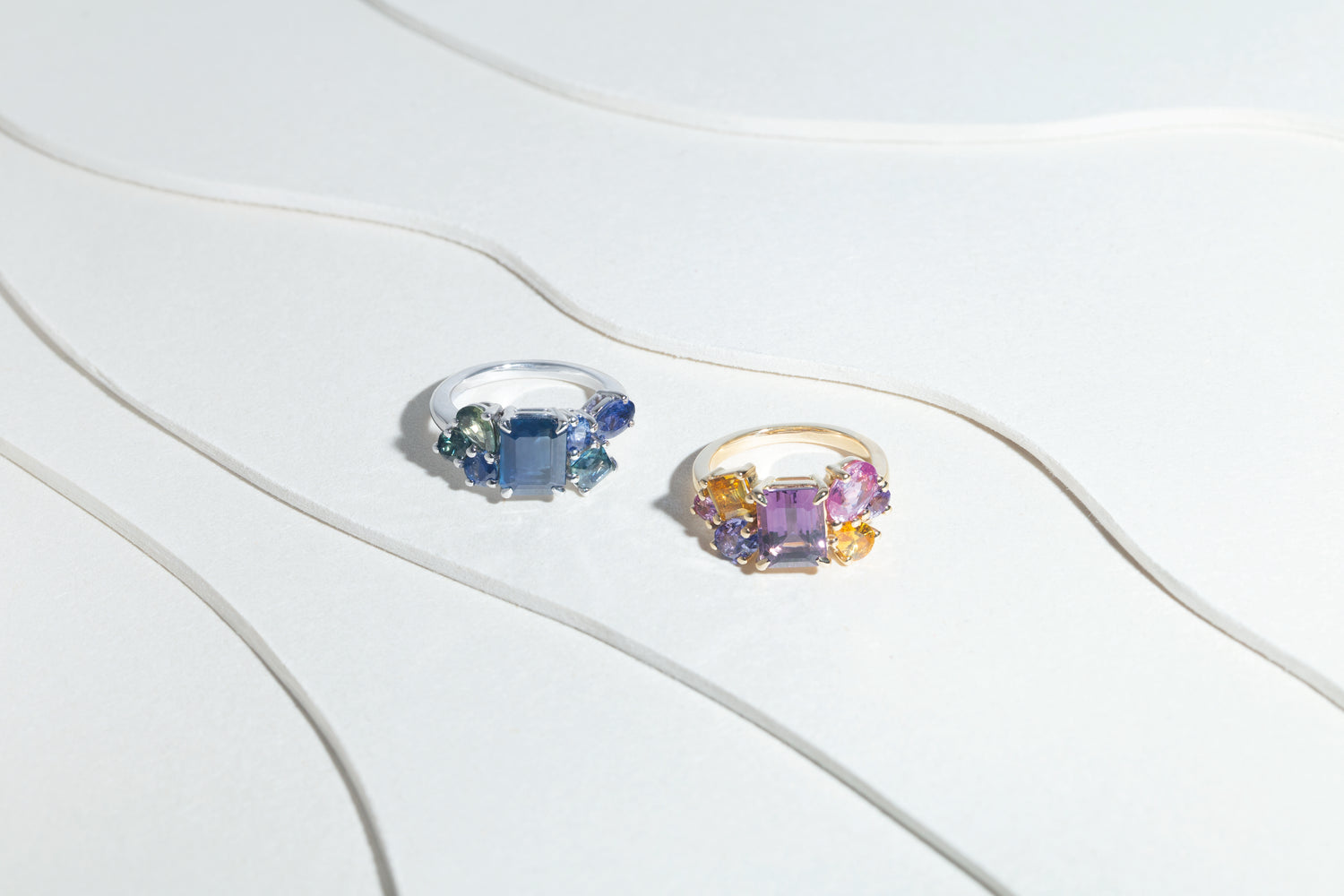 Une variation autour du bleu, comme une partition minérale jouée sur sept tonalités. Chaque saphir trouve sa place dans une composition à la fois brute et équilibrée, évoquant les reflets changeants de la glace sous la lumière. Une construction libre qui sublime la pierre dans toute sa diversité.