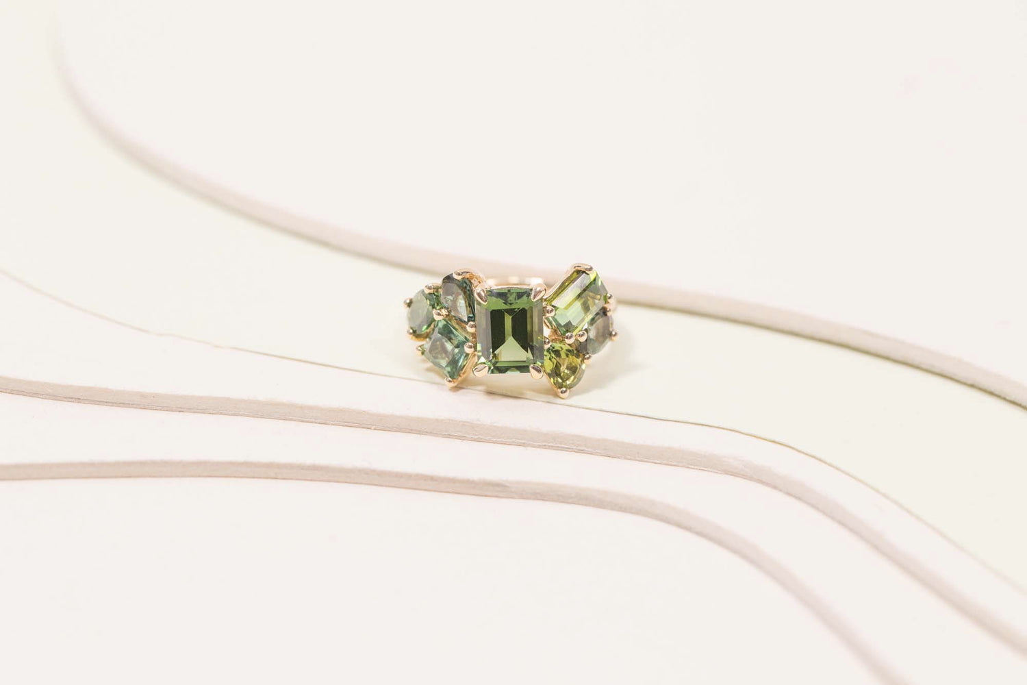 Un écrin de lumière et de contrastes, où chaque tourmaline dévoile sa propre nuance de vert. Assemblées avec soin, ces sept pierres vibrent à l’unisson, comme un feuillage baigné de soleil. Leur dialogue minéral évoque la nature dans son mouvement, sa richesse, sa grâce profonde et imprévisible.