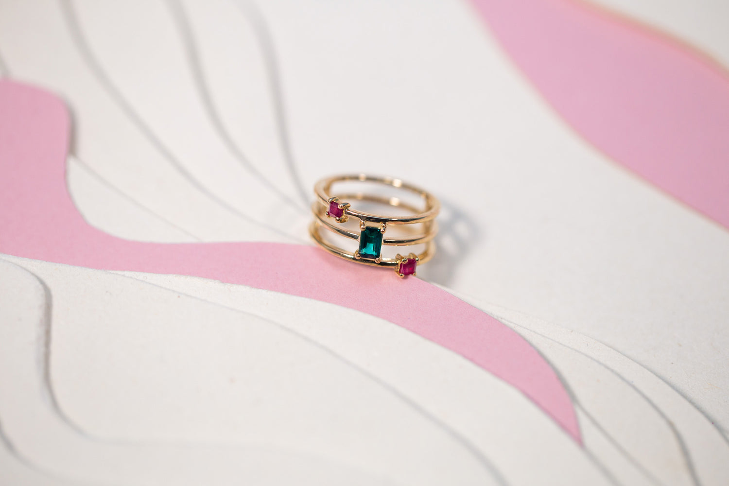 "Couleurs franches, lignes nettes. Cette bague raconte la rencontre entre le feu des rubis et la transparence vibrante d’une tourmaline. Inspirée des fractures géologiques, elle joue des contrastes avec équilibre et élégance."