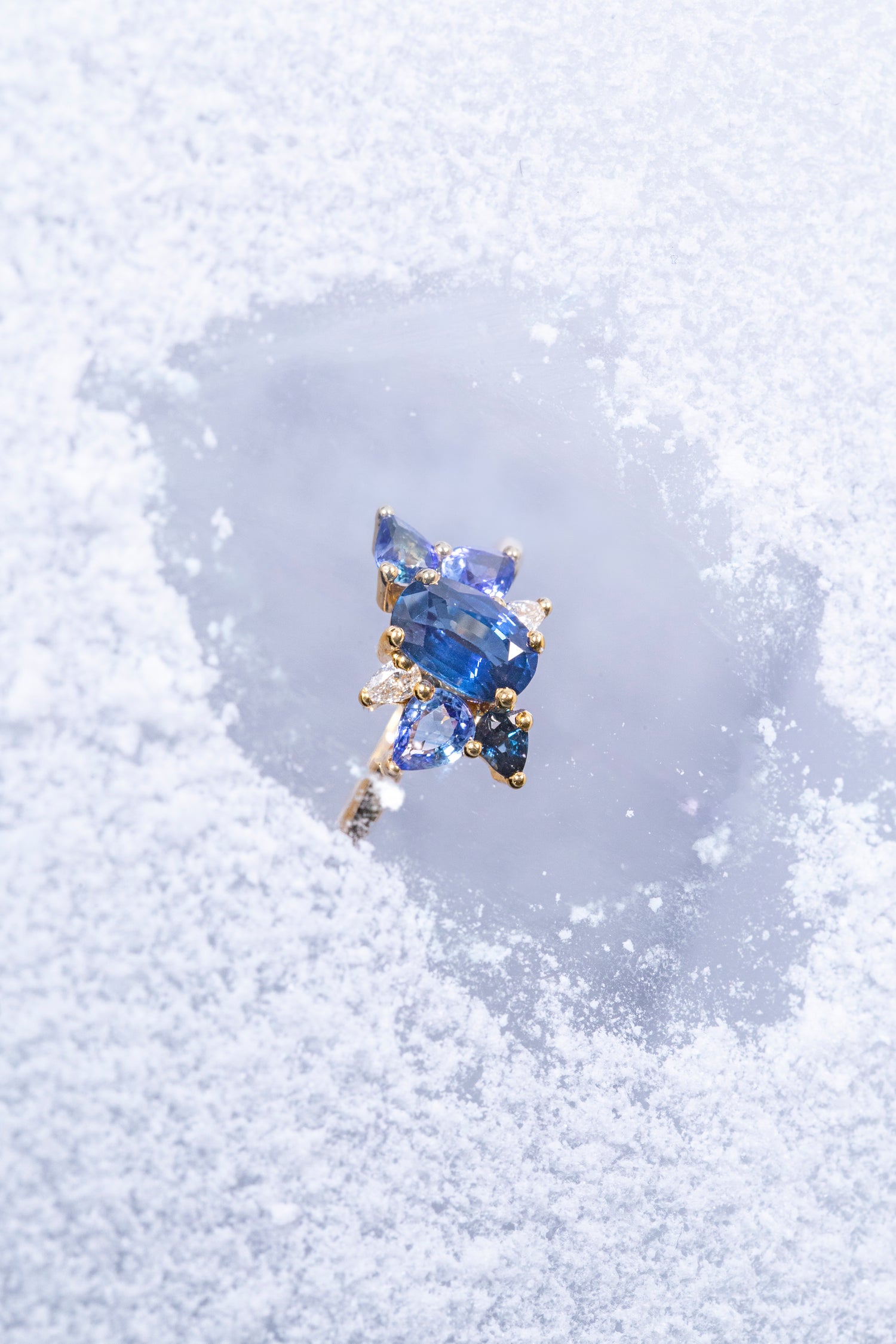 "Un saphir ovale et quatre gemmes bleues dessinent une palette glacée, relevée par deux diamants poire. Montées en serti griffe sur or recyclé, les pierres évoquent un fragment de glacier, à la fois brut et délicat. Une silhouette lumineuse inspirée des paysages polaires."