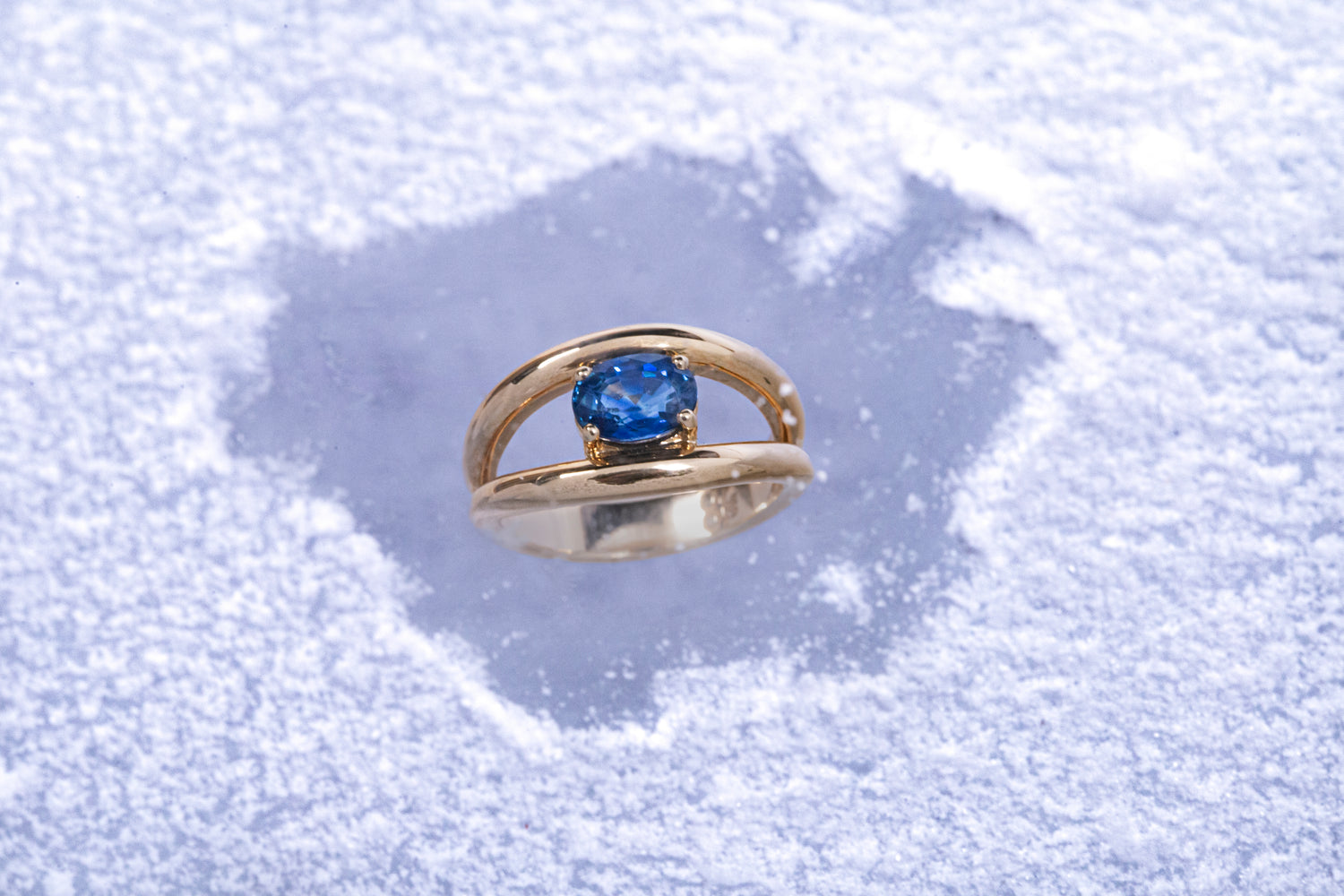 "Un saphir de Ceylan, profond et vibrant, repose entre deux joncs d’or jaune recyclé. Sa taille parfaite et son éclat azur captivent le regard. Une mise en scène sculpturale et minimale qui révèle toute la puissance de cette gemme au charme rare et intemporel."