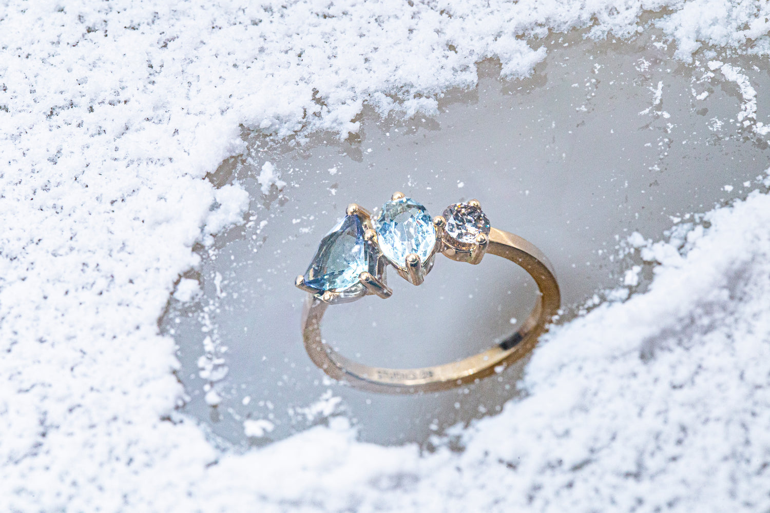Bague en or 750°° recyclé, tanzanite, aigue-marine et diamant brun.
