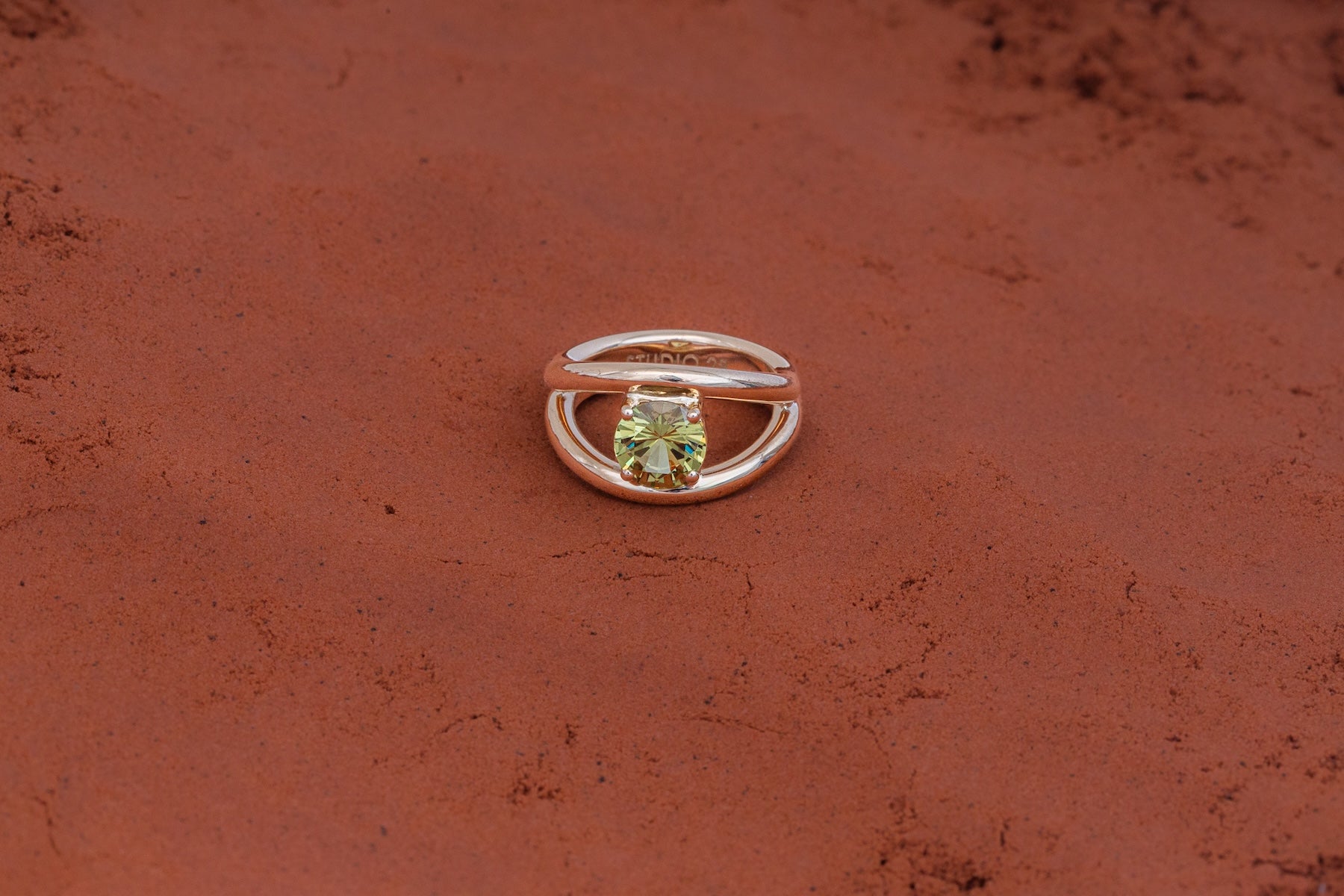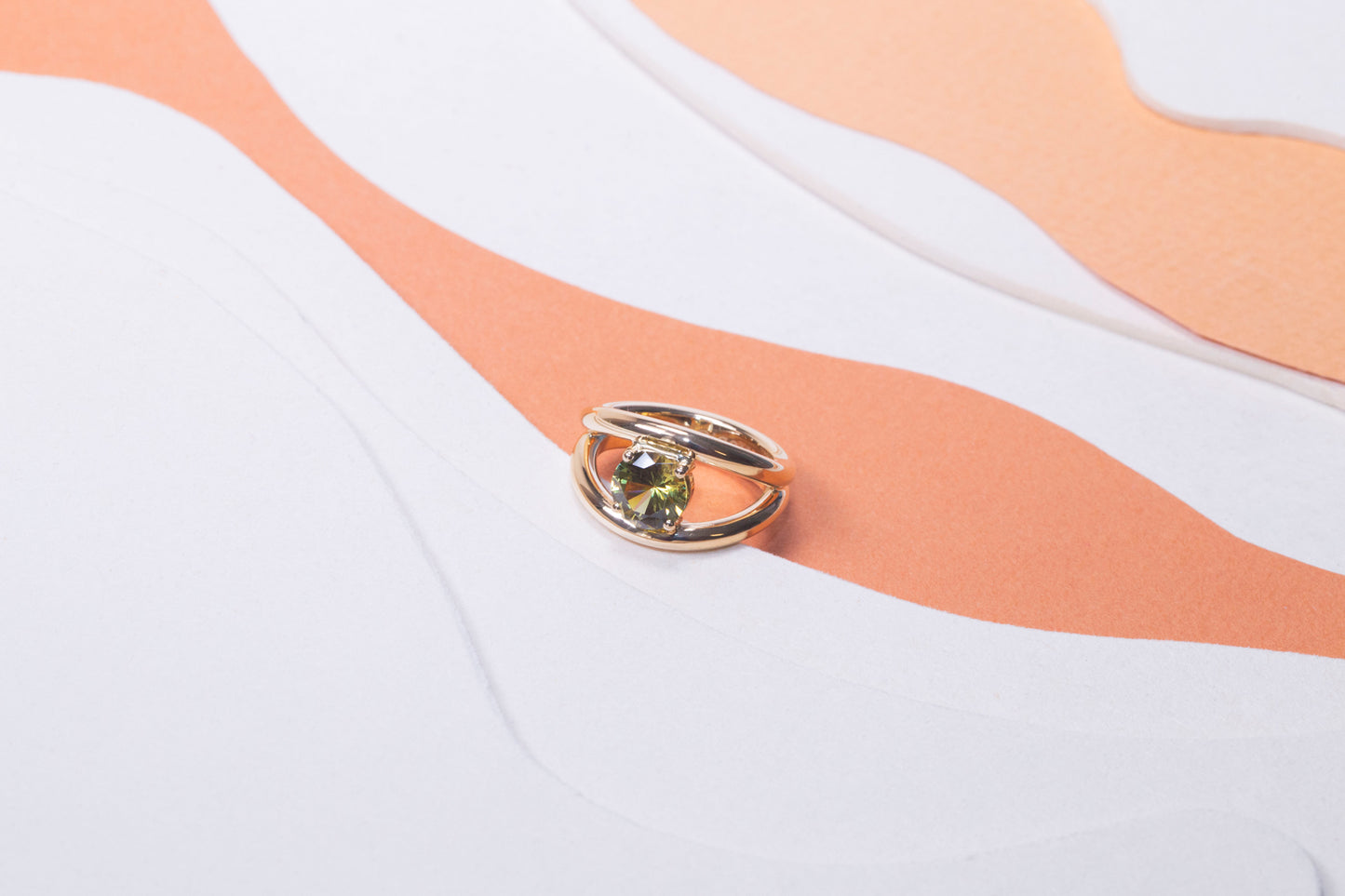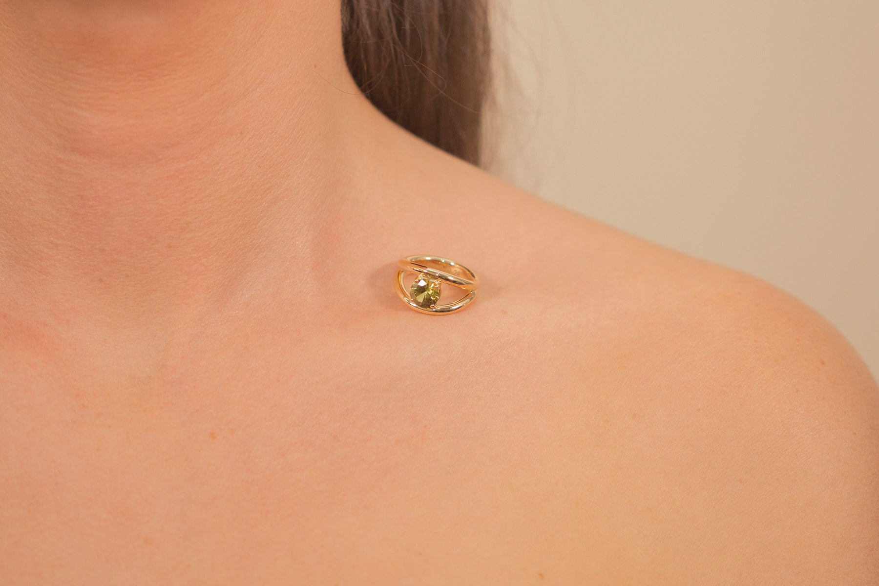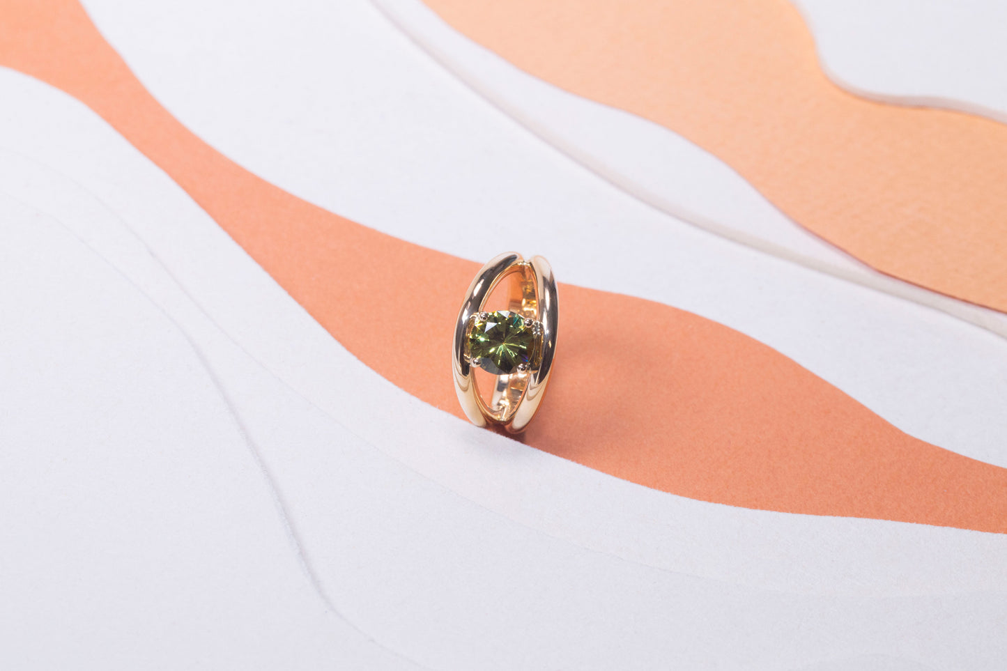 "Serti en apesanteur, ce grenat vert d’exception dialogue avec la structure aérienne du jonc. La maîtrise technique est manifeste dans le sertissage qui semble suspendre la pierre, tout en garantissant solidité et confort."