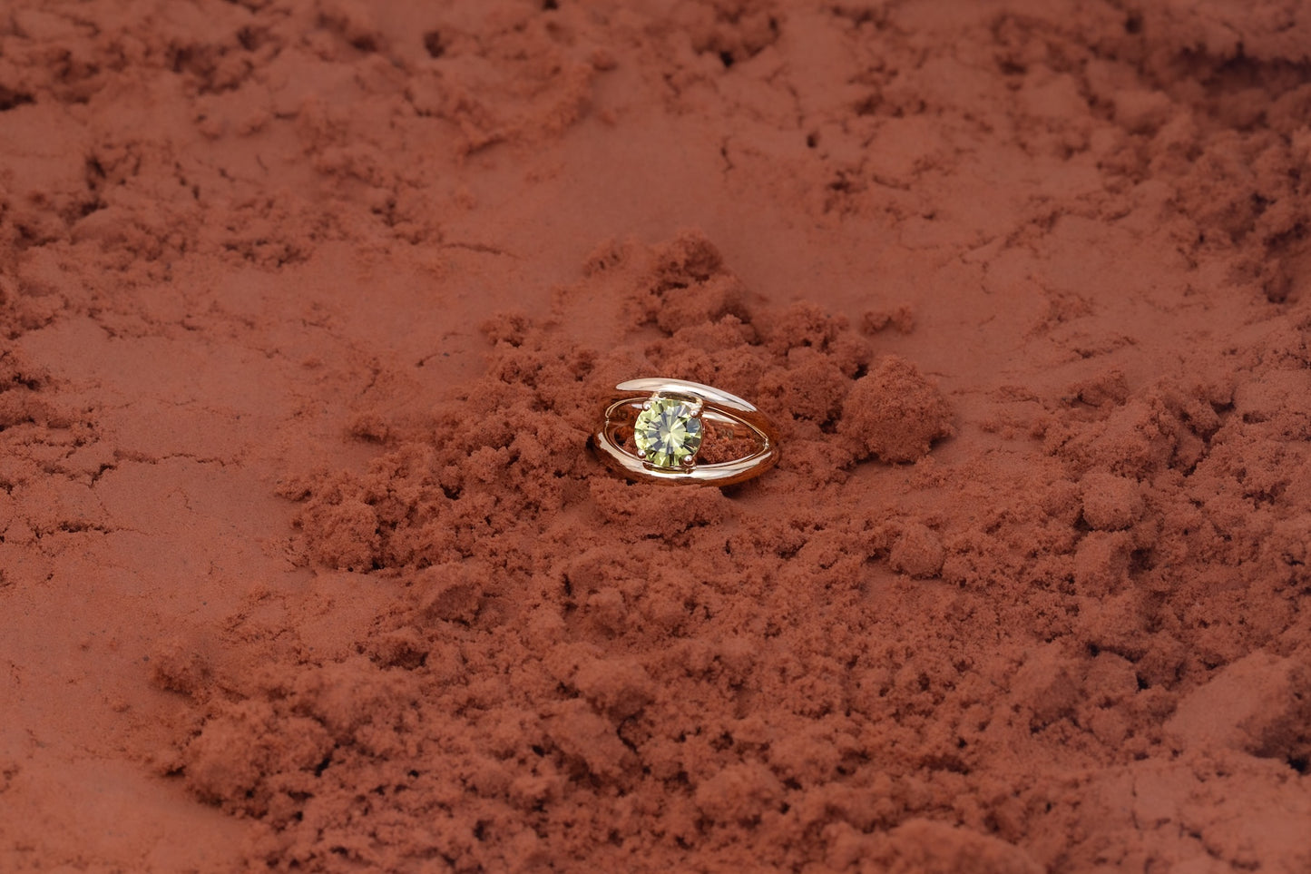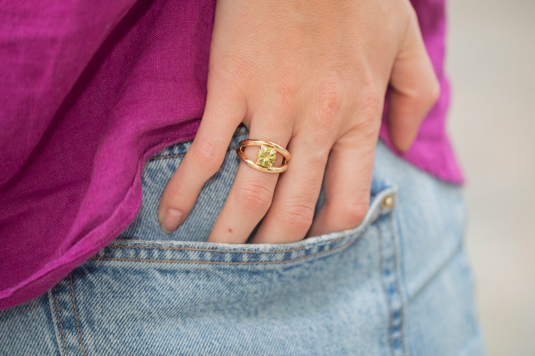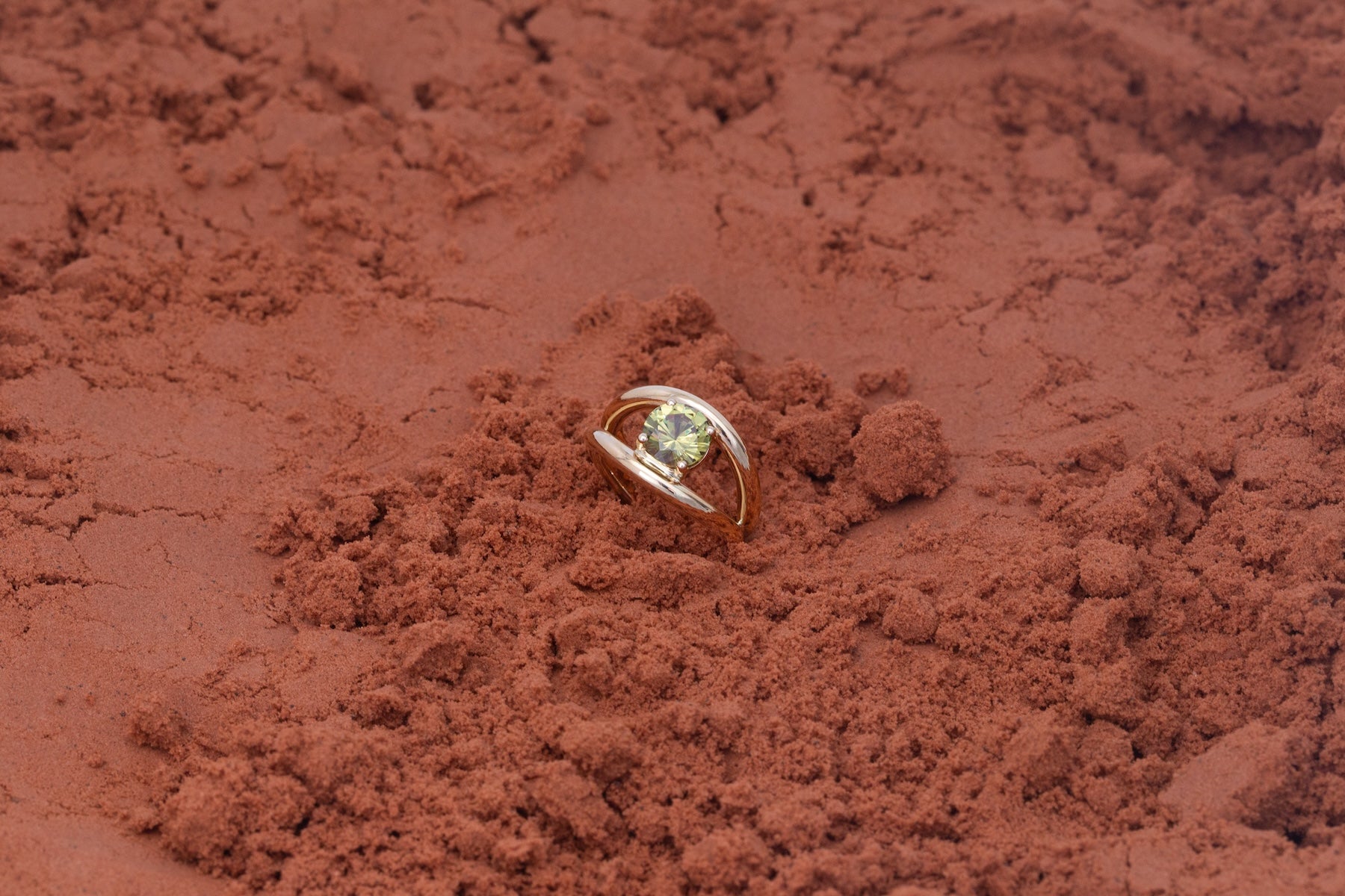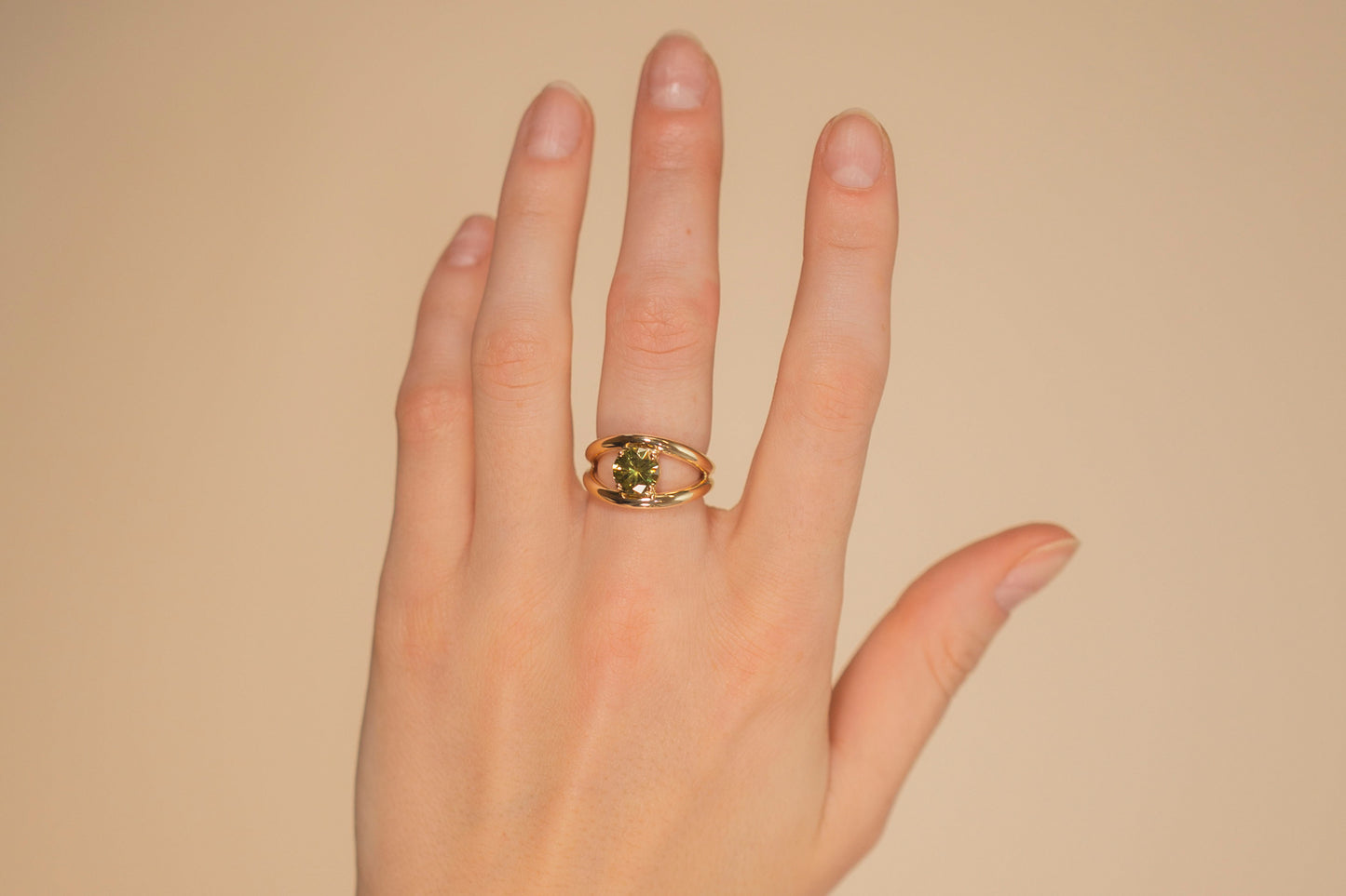 La bague Ravine jonc porte en son cœur un grenat vert du Mali de 1,90 ct, exceptionnel par sa brillance et sa profondeur. Montée sur de l'or jaune 18 carats recyclé, cette bague unique est façonnée à la main dans notre atelier lyonnais. Son vert vibrant évoque les fonds frais des ravines du Sud, où l'eau affleure encore entre les pierres. La ligne pure du jonc crée un jeu d'équilibre et de tension, laissant la pierre en apesanteur, libre de capter la lumière et de refléter les mouvements du corps. Une pièce unique, lumineuse et graphique, qui capture l'essence des paysages naturels.