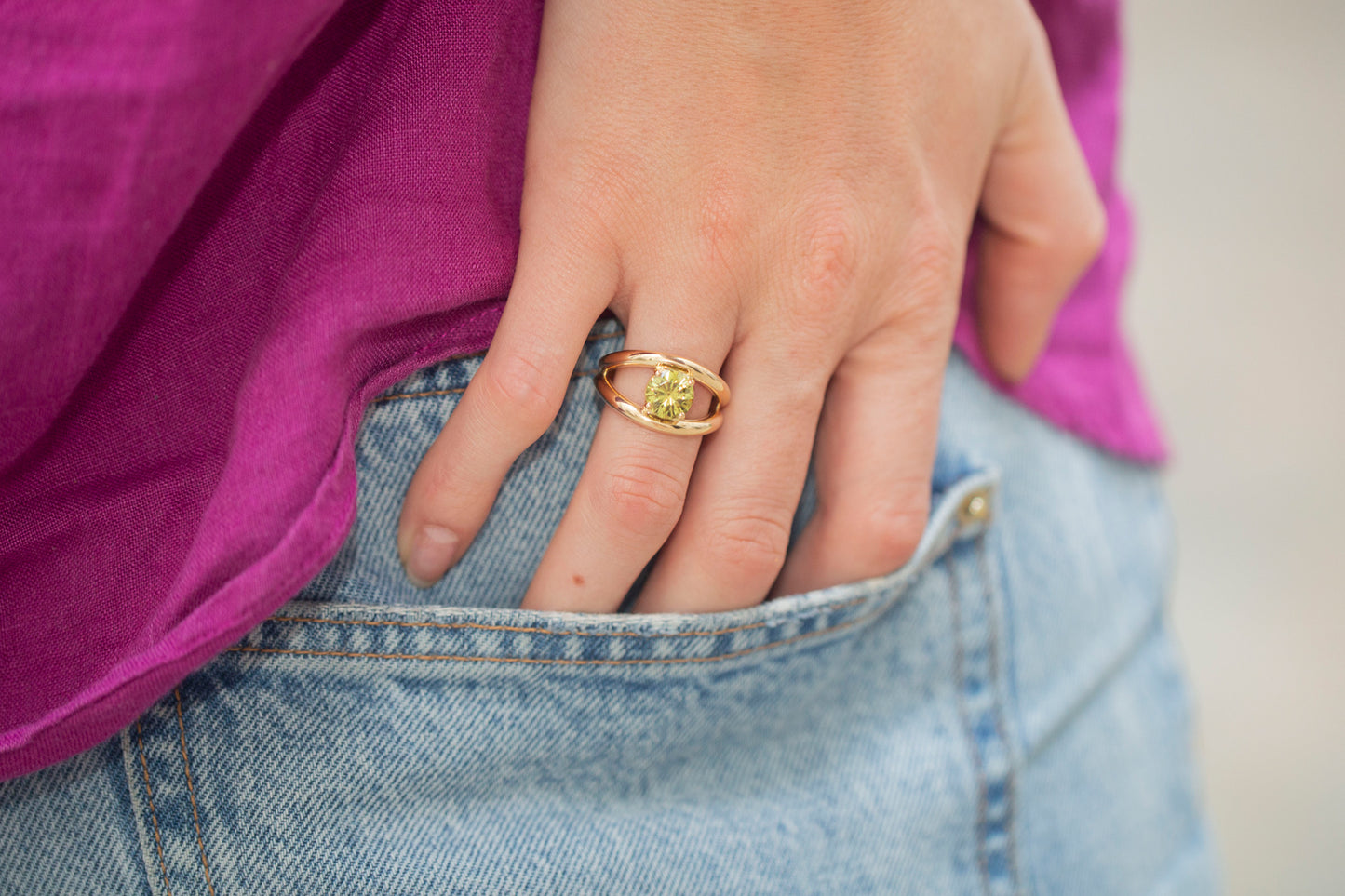 Comme sur chacune de nos créations, sa pierre est unique et méticuleusement sélectionnée par Pierre. Une fois le dessin finalisé, les pierres et les croquis techniques sont transmis à l'atelier. Nos joailliers fabriquent chaque partie de la bague sur place, à la main, à partir de fil d'or 750°° et de plaques réalisées sur place. Les chatons (partie qui soutiennent les pierres) sont construits sur-mesure pour la pierre qu'ils porteront et le corps de la bague est tiré et mis en forme pour coller parfaitement au design.