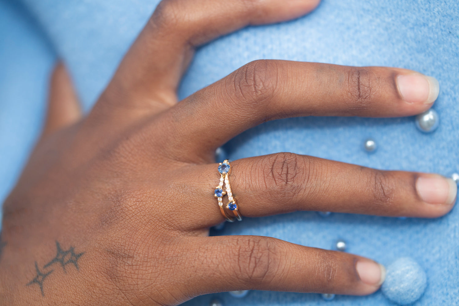 "Trois saphirs bleus facettés rencontrent onze diamants scintillants sur un anneau fin en or recyclé. Le contraste entre intensité azur et brillance blanche crée une vibration lumineuse. Une pièce aux proportions délicates, joyeuse et résolument contemporaine."