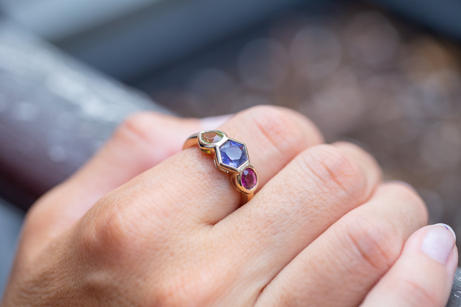 "Un trio de pierres comme un accord de couleurs. Iolite, tourmaline verte et rose composent une partition libre, contrastée et lumineuse. Les formes s’emboîtent avec rigueur dans un serti dessiné au millimètre. Un bijou vivant, vibrant, à l’équilibre singulier."