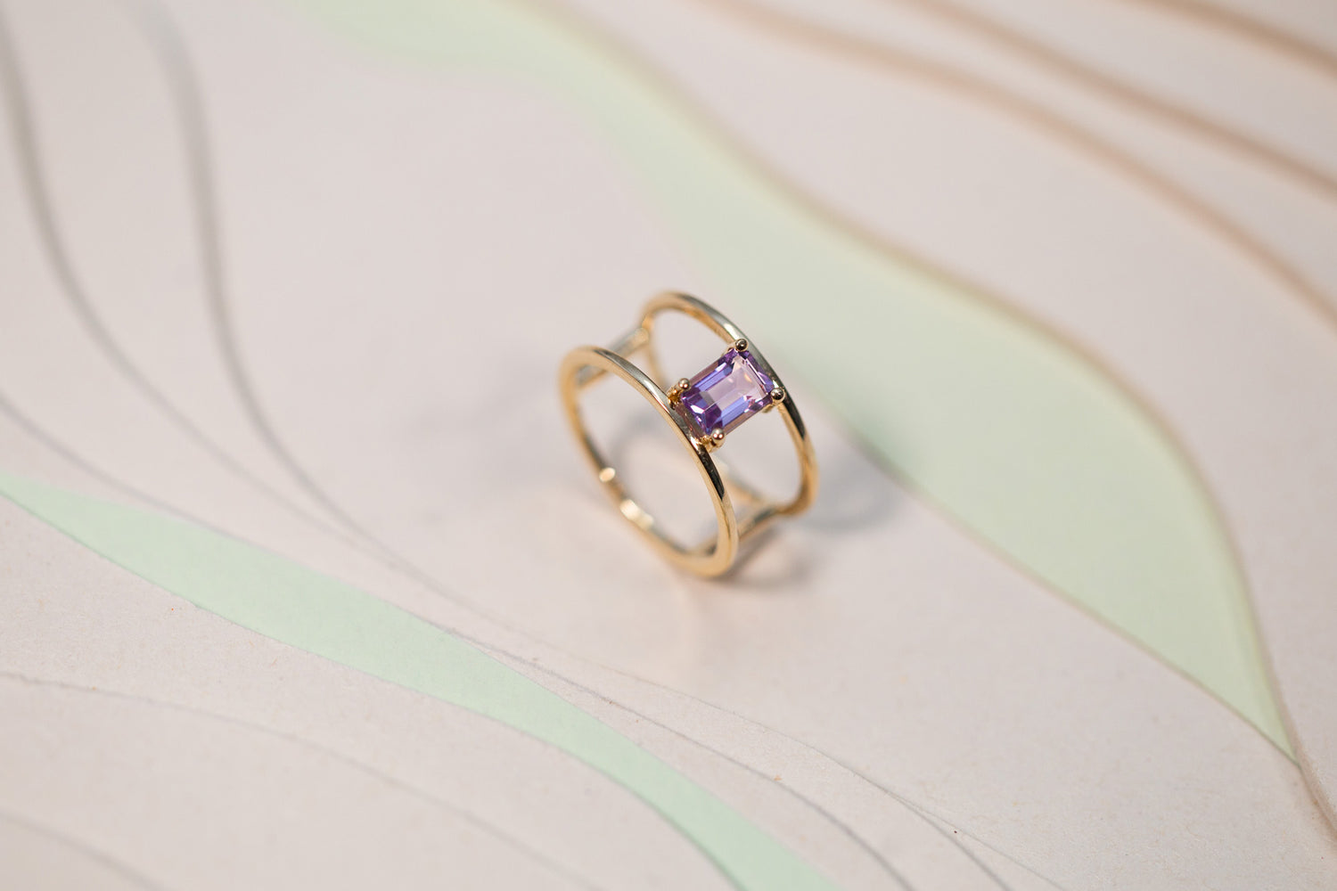 "Une améthyste claire et limpide, posée comme une goutte de lumière. Suspendue entre deux anneaux d’or, la pierre semble flotter. Lignes pures, éclat franc : un bijou pensé comme un souffle de couleur, léger et intemporel."