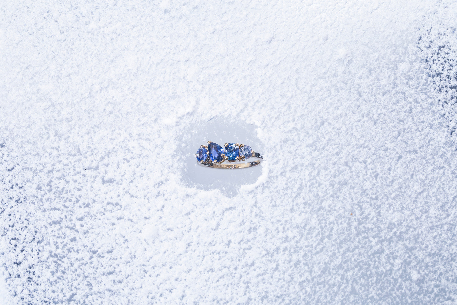 "Quatre saphirs aux formes variées tracent une ligne pure et cristalline. Leurs teintes glacées, posées sur un corps fin en or jaune, évoquent une vallée figée par la lumière rasante. Un bijou unique, fluide et graphique, qui sublime chaque éclat de pierre."