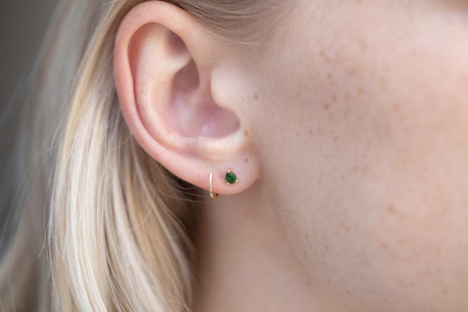 "Petite par la taille, grande par la présence. La tsavorite révèle un vert brillant, cristallin, qui s’équilibre avec finesse dans une structure discrète. Un éclat juste, posé comme un accent sur le lobe. Lignes graphiques et éclat naturel pour une allure fraîche et délicate."