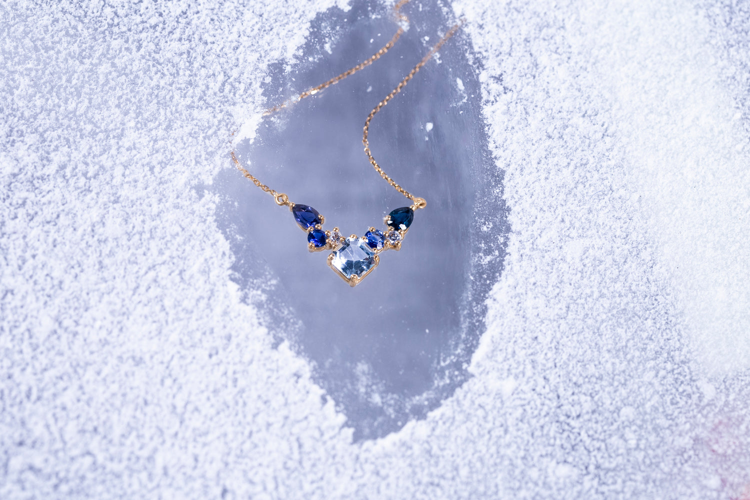 "Inspiré par les reflets glacés du Nord, un assemblage de saphirs, aigue-marine, iolite et diamants compose une harmonie bleutée. Chaque pierre devient un éclat figé, pur, vibrant. Une composition libre, entre froid minéral et lumière dorée."
