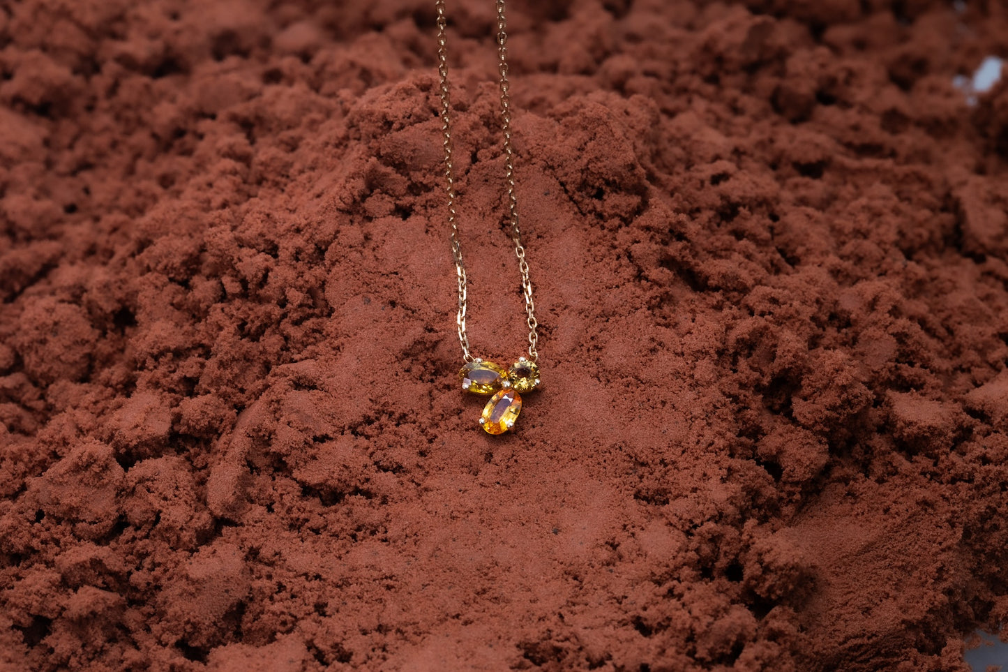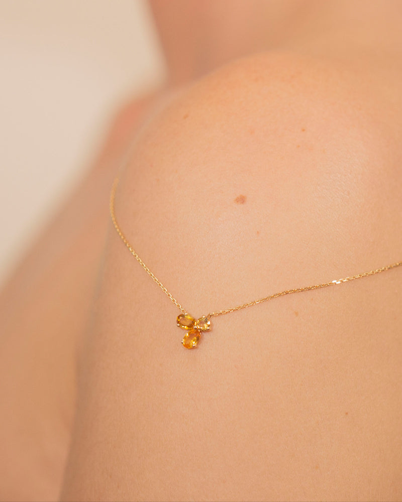 "Un soleil suspendu semble naître de deux saphirs jaunes et d’une citrine, qui tracent une ligne dorée, vibrante et rythmée. Taillées différemment, les pierres dialoguent en léger décalé pour composer un graphisme fluide. L’or jaune recyclé embrasse leur éclat, comme un rayon illumine le cou."