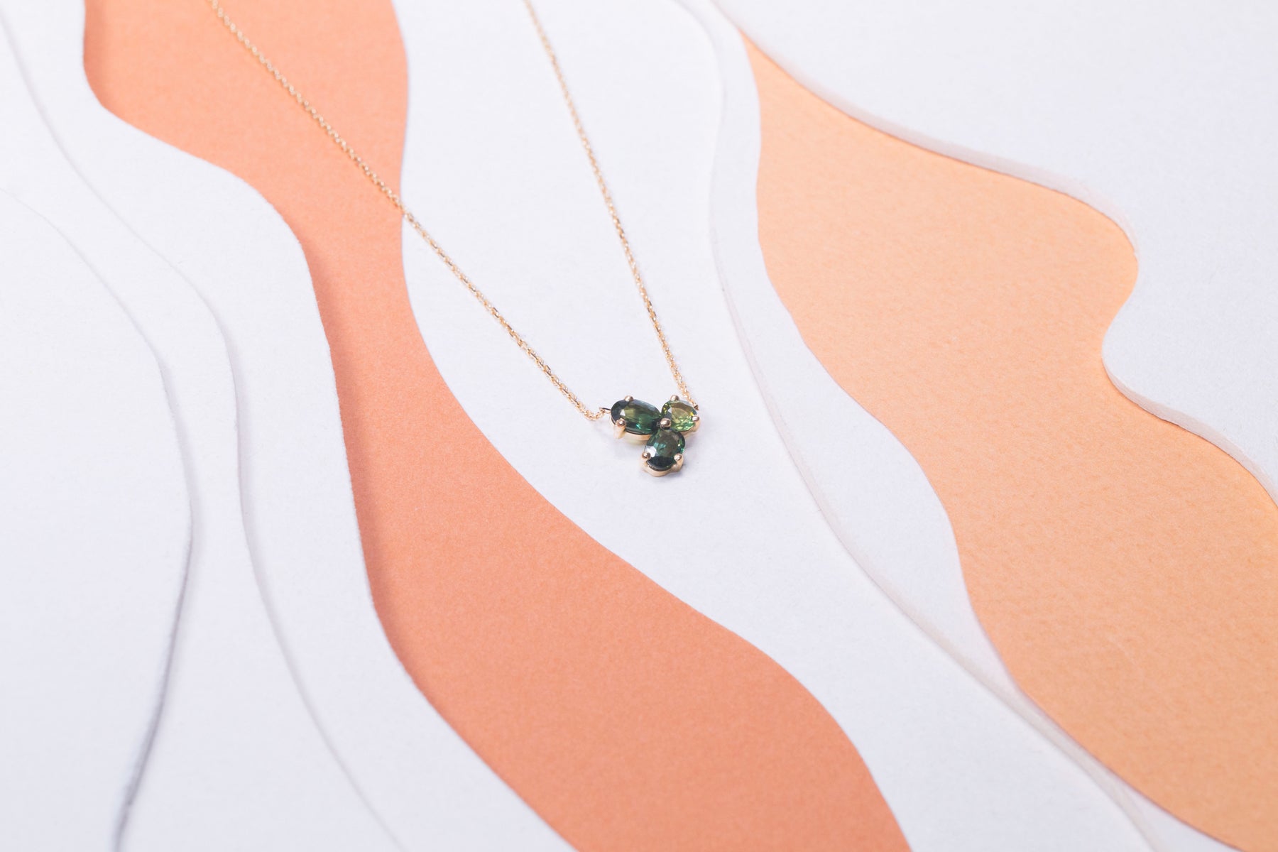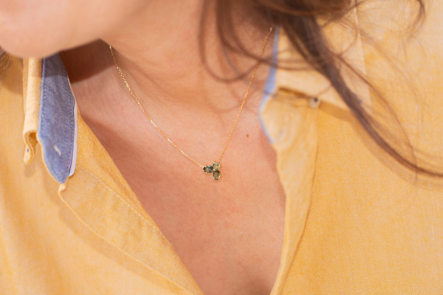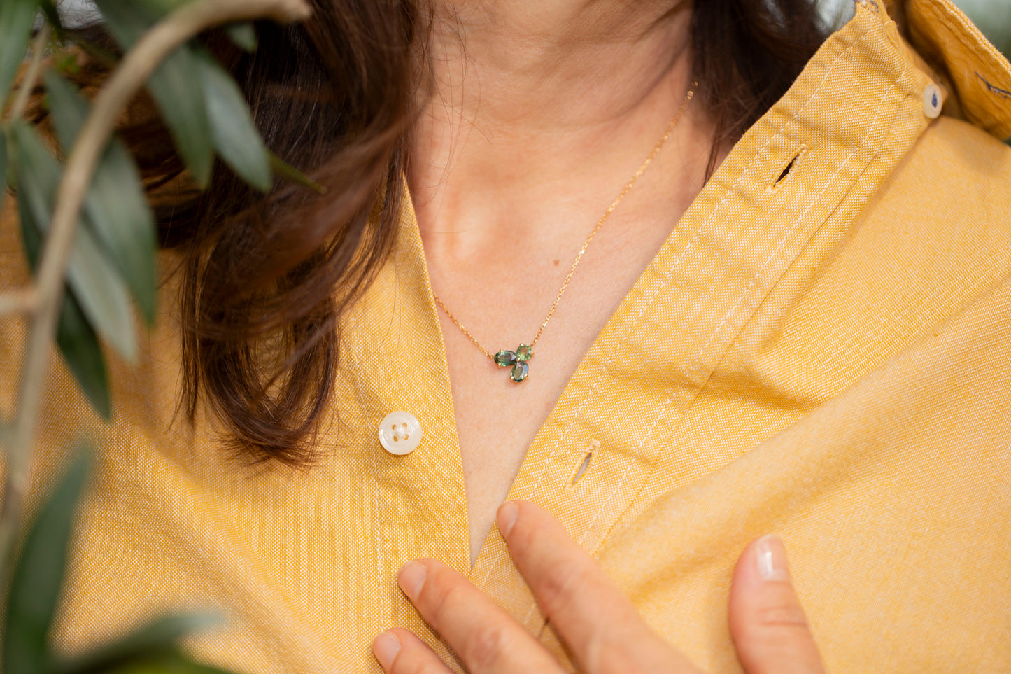 "La nature se transforme en bijou à travers trois saphirs verts, ovales et ronds, qui s’alignent en une rivière vivante. Serties en griffes, les pierres semblent flotter comme des feuilles portées par l’eau. L’or jaune recyclé intensifie leur vert profond dans un équilibre à la fois organique et graphique."