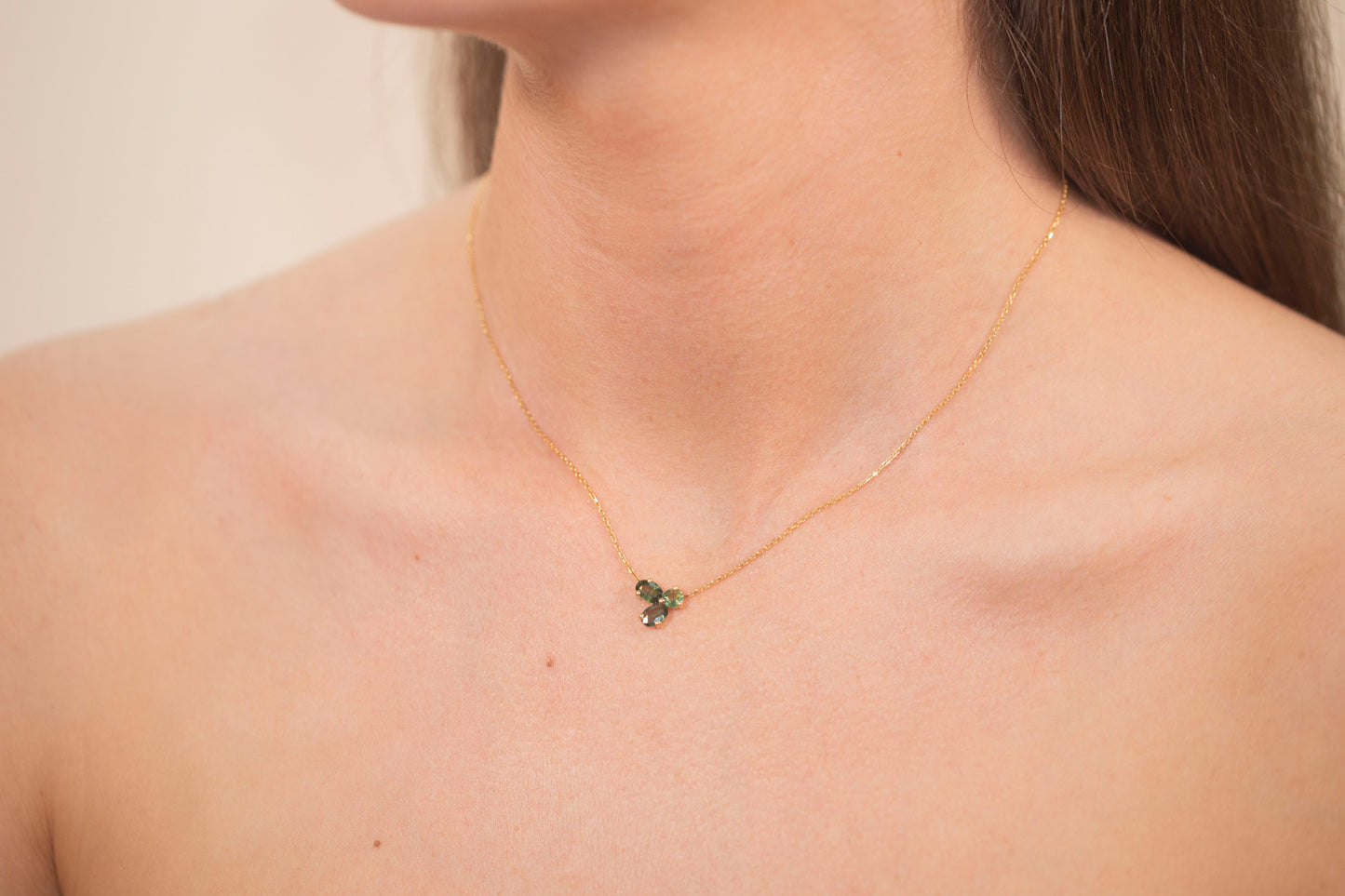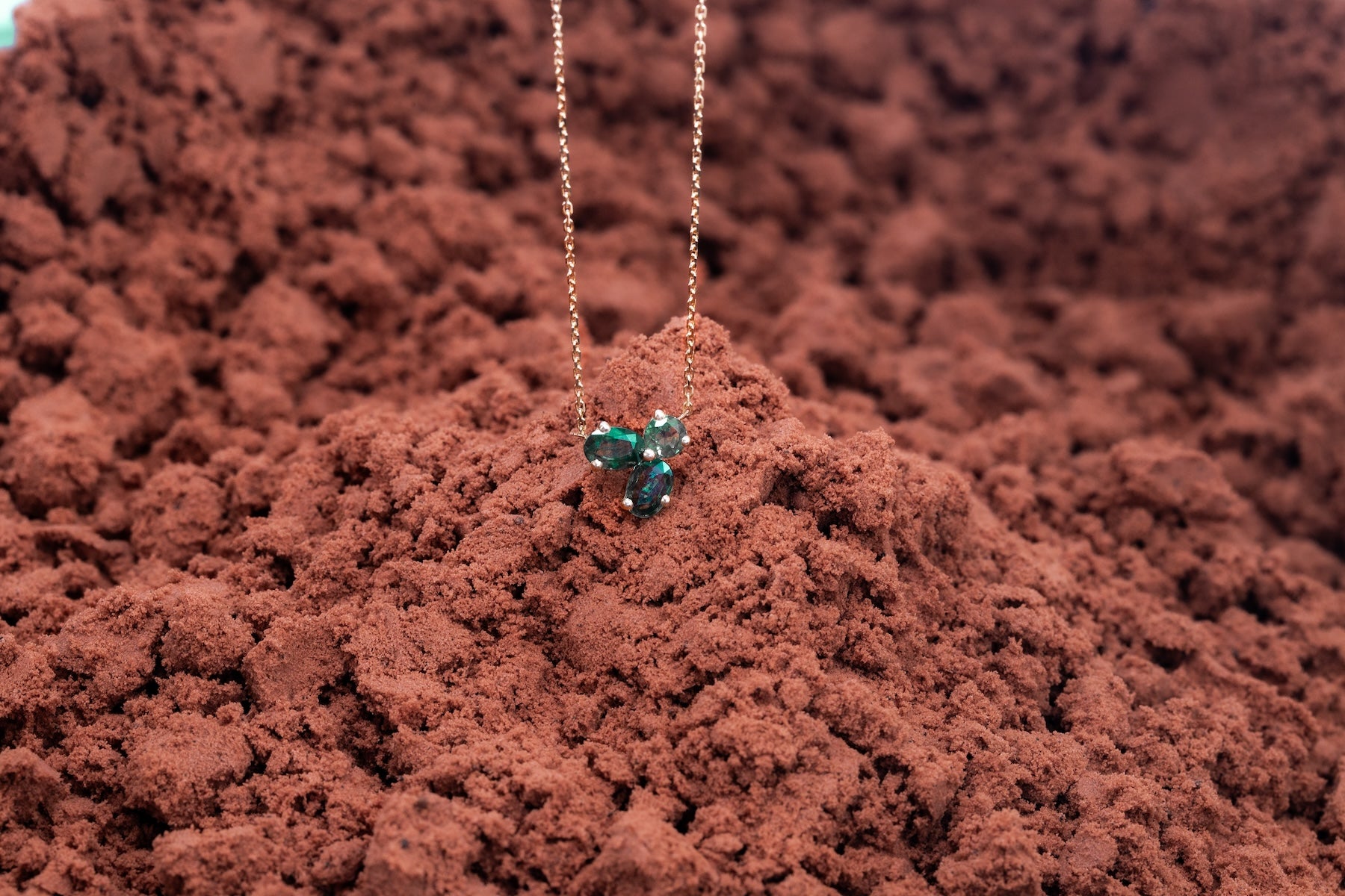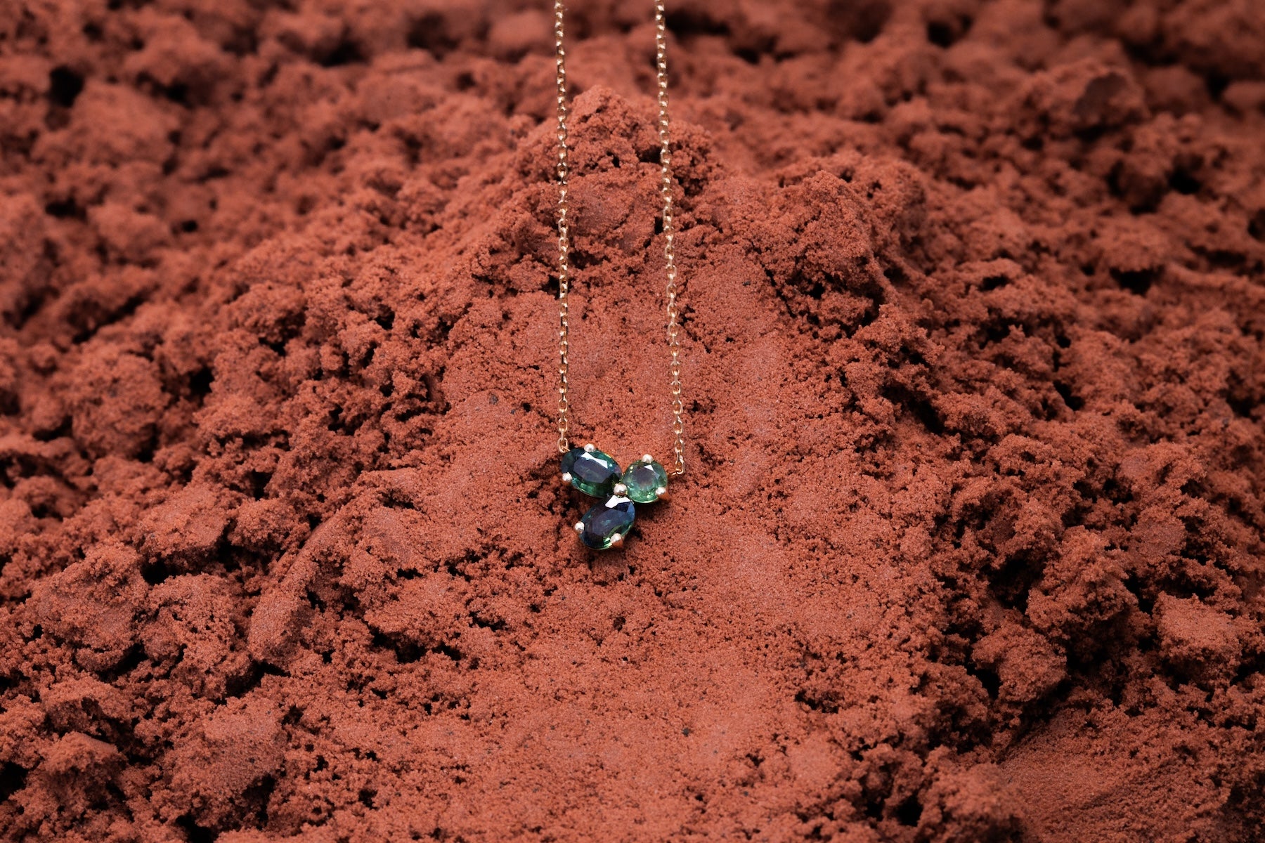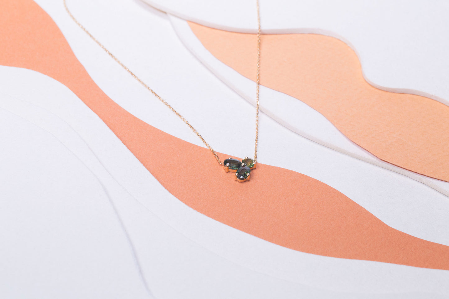 "La nature se transforme en bijou à travers trois saphirs verts, ovales et ronds, qui s’alignent en une rivière vivante. Serties en griffes, les pierres semblent flotter comme des feuilles portées par l’eau. L’or jaune recyclé intensifie leur vert profond dans un équilibre à la fois organique et graphique."