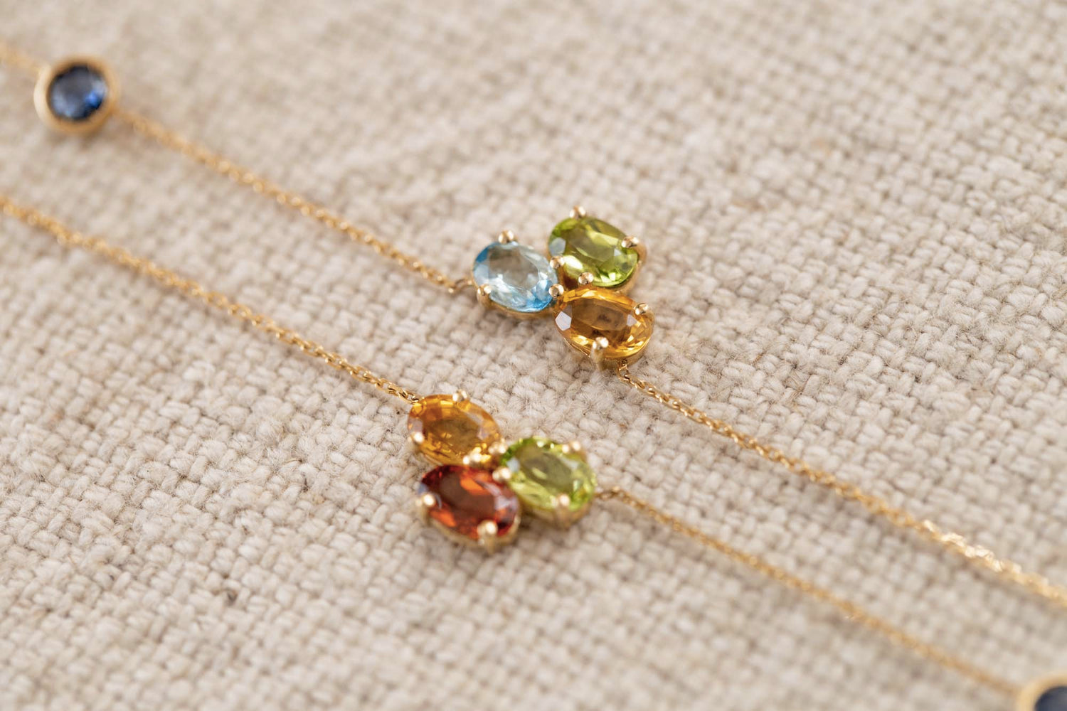 "Ce bijou est né d’un jeu : associer des pierres fortes et contrastées comme un flot de lumière. Chaque gemme porte une couleur franche, chaque forme trouve sa place dans une composition fluide et vivante."