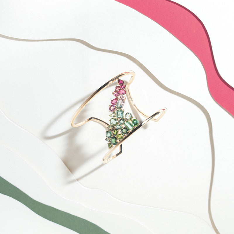 "Un ballet de couleurs s’anime autour du poignet. Trente-cinq tourmalines vertes, roses et bicolores s’entrelacent en une manchette sculpturale. Chaque pierre, facettée et sertie en griffes, capte la lumière dans un graphisme asymétrique sur or jaune recyclé. Enveloppant le bras comme un drapé, cette pièce allie force et légèreté minérale."