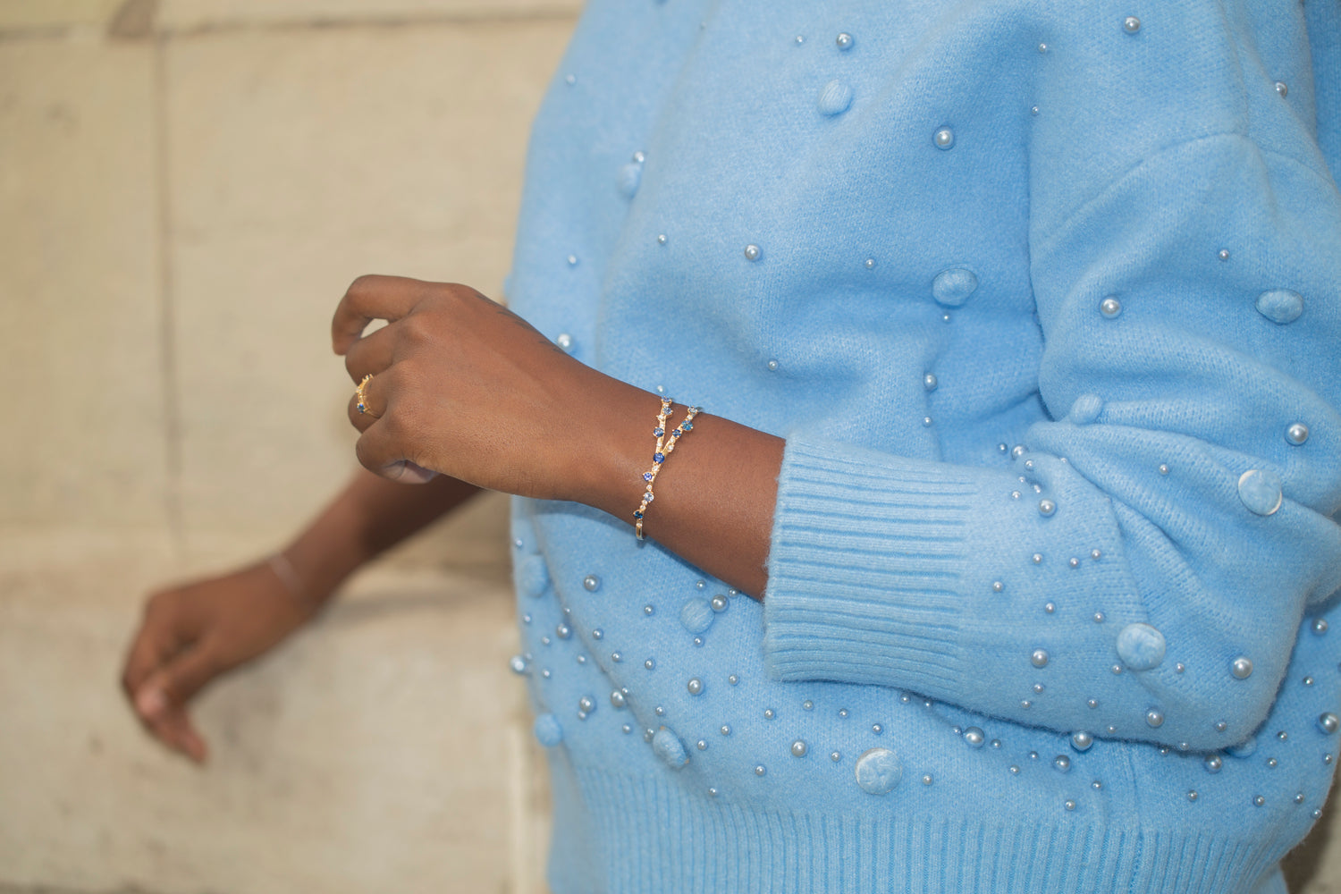 "La nuit étoilée s’invite sur la peau. Dix saphirs d’un bleu profond et dix diamants scintillants dialoguent sur une manchette ouverte en or jaune recyclé. Les sertis griffes dessinent un rythme précis, chaque pierre révélant un éclat maîtrisé. Un hommage poétique aux cieux nocturnes et au silence minéral."